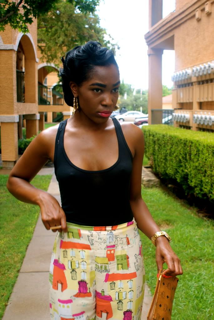 I found these pants at a goodwill earlier this summer and can't wait to see what looks I can put together with them for the fall.Mary Jane pumps are from F21 (Miu Miu knockoffs). Ghetto girl door knocker earrings. MCM cosmetic bag worn as clutch.